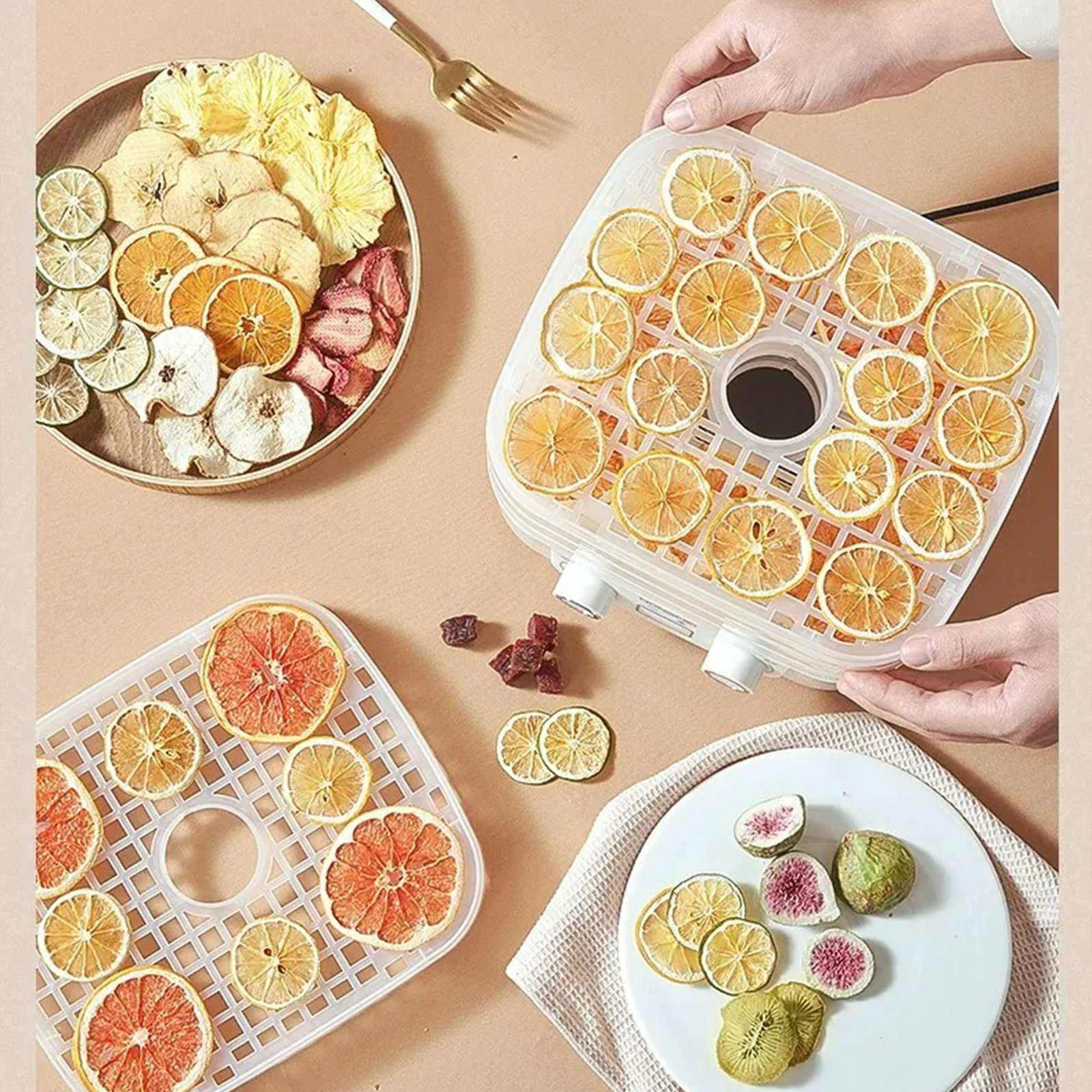 مجفف الطعام المنزلي متعدد الوظائف يتيح لك تحضير وجبات خفيفة صحية وحفظ الفواكه والخضروات واللحوم والأعشاب بسهولة، مع الحفاظ على النكهة والقيمة الغذائية لكل المكونات بفضل نظام الهواء الساخن المتطور والتحكم الدقيق في الحرارة والوقت.